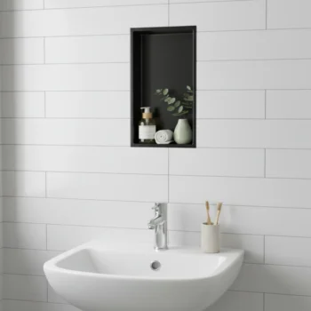 This is a Double Partition Recessed Shower Niche, designed for modern, space-efficient bathrooms.