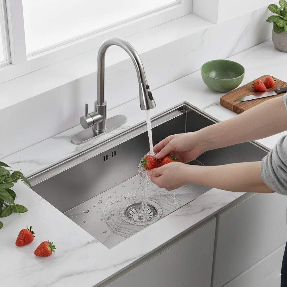 Included accessories—solid wood cutting board, roll-up drying rack, stainless-steel colander, and protective bottom grid—allow you to prepare, rinse, and dry efficiently, all in one place. The X-shaped drainage grooves ensure fast water flow and prevent pooling, while sound-dampening pads minimize noise during use.
